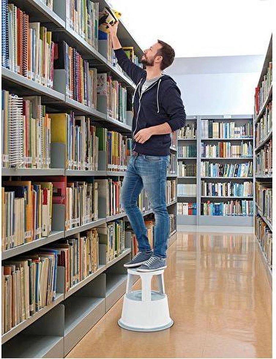 Gemaakt van gepoedercoat staal. Gemonteerd op 3 zwenkwielen die volledige mobiliteit mogelijk maken die zich terugtrekken wanneer het krukje belast wordt, waardoor een veilig platform wordt geboden. Stappen zijn voorzien van antislip rubberen matten. Geen gereedschap nodig om te monteren.